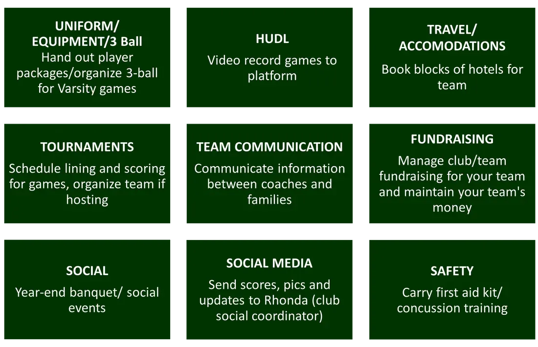 For each team, parents must sign up for one of the following roles to assist the team, coaches and club. The team coach will hold a meeting at the beginning of the season to explain the roles then parents can sign up for a role.